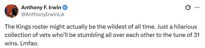 随后湖人记者Anthony F. Irwin更新动态,写道:国王的阵容恐怕是史上最为离奇的了。凑齐这么一帮老将,到头来不过是互相拖后腿,最后勉强凑个31胜。真是笑死人了。